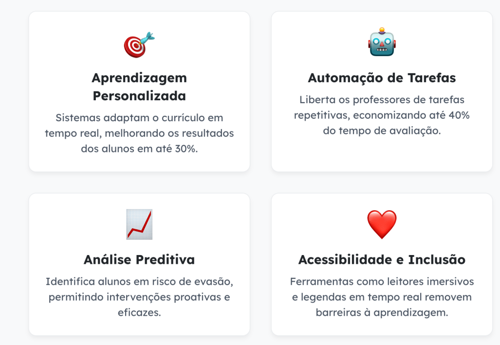 A análise das aplicações mais comuns revela uma dualidade importante. Embora esses ganhos de eficiência sejam valiosos para profissionais sobrecarregados e estudantes pressionados, eles ainda não representam a profunda transformação pedagógica que a IA promete.