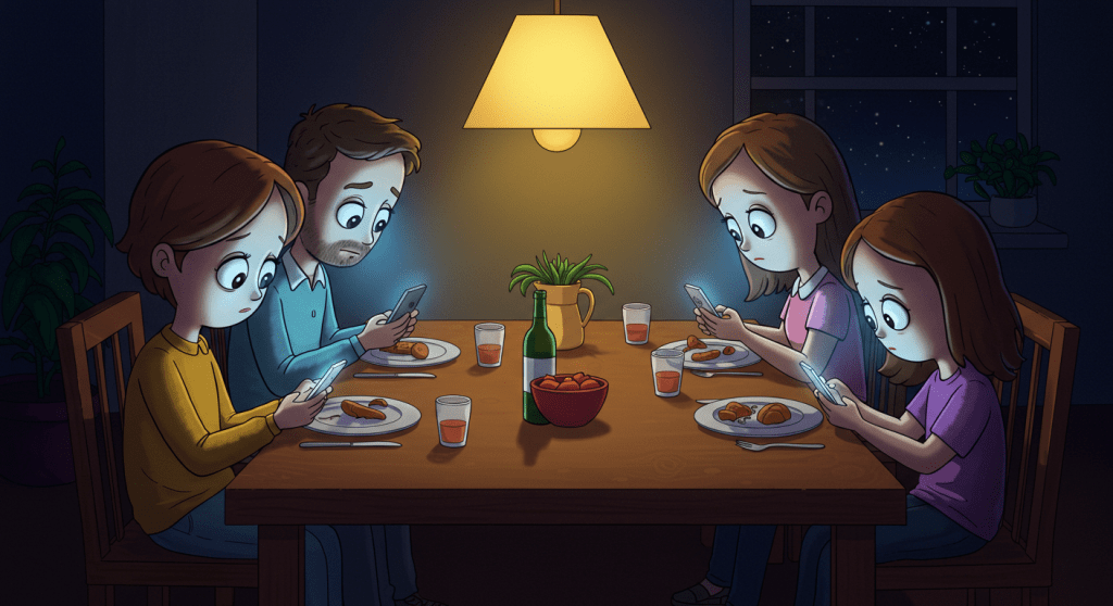 O uso constante de telas em casa cria o fenômeno “sozinhos juntos”: pessoas na mesma sala, mas sem interação real (Happetive, 2025). Isso reduz o tempo de qualidade em família e prejudica a comunicação.